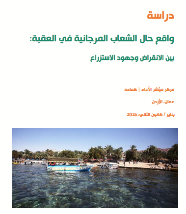 تأتي هذه الدراسة ضمن سلسلة الدراسات التحليلية التي يصدرها مركز مؤشّر الأداء | كفاءة، وتهدف إلى تقديم تقييم شامل للوضع البيئي للشعاب المرجانية في خليج العقبة، مع متابعة تأثير النشاطات البشرية والمينائية والسياحية على استدامتها، وتحليل أبرز التحديات والفرص للحفاظ على هذا النظام البيئي البحري الحيوي